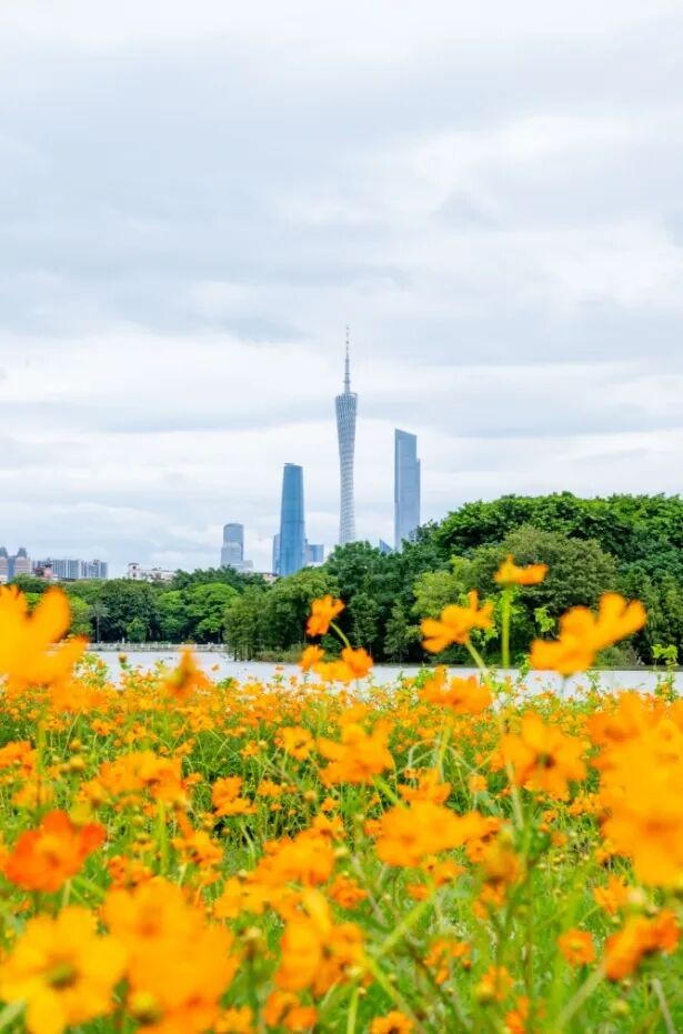 朵朵花瓣迎著暖陽舒展,與湖對面廣州塔的銀灰色塔身相映,波光粼粼的湖面倒映著花海與塔影,隨手定格都是秋日里最治愈的水彩畫卷。微風拂過激起層層“花浪”