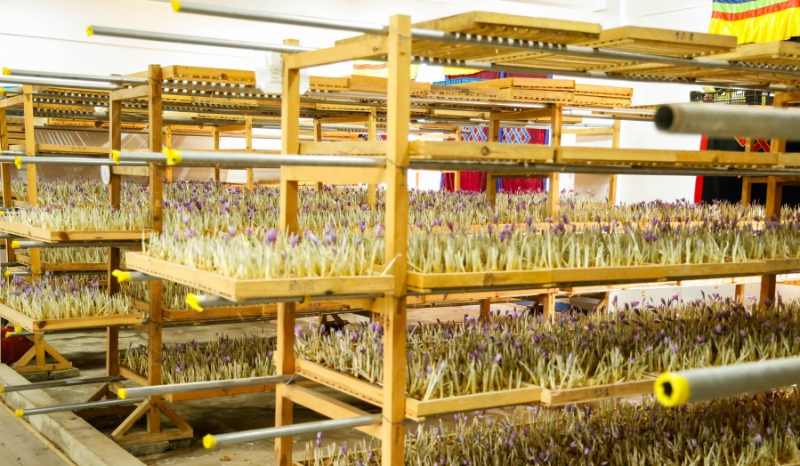 據(jù)了解,藏紅花屬于亞熱帶植物,喜歡在溫暖濕潤的環(huán)境中生長(zhǎng),耐寒、耐半陰,塔城鎮(zhèn)陽光充足、氣候適宜,為藏紅花生長(zhǎng)提供了良好條件。每年5月,農(nóng)戶將藏紅花種球從地里挖出,轉(zhuǎn)入育花房進(jìn)行為期六個(gè)月的“育花”,育花房?jī)?nèi)濕度基本保持在70%到80%,溫度適宜。花朵開放后,農(nóng)戶當(dāng)天采收、當(dāng)天烘干并保存,便于銷售,11月中旬再將花球移栽回土地進(jìn)行“育種”,直至來年新的球莖長(zhǎng)出來。目前,塔城鎮(zhèn)藏紅花種植面積在120畝左右,每畝可產(chǎn)出成品花絲約700克。