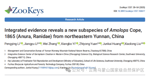2025年10月24日,云南烏蒙山國家級(jí)自然保護(hù)區(qū)管護(hù)局與西南大學(xué)最新調(diào)查成果——大方湍蛙烏蒙亞種在國際動(dòng)物分類學(xué)期刊《ZooKeys》發(fā)表。