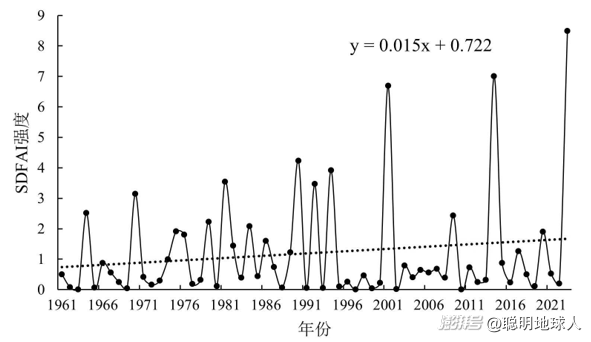 1961-2024年河南省旱澇急轉(zhuǎn)指數(shù)強(qiáng)度年際變化 (旱澇急轉(zhuǎn)指數(shù)SDFAI絕對值表征旱澇急轉(zhuǎn)劇烈程度,絕對值越大則強(qiáng)度越大)[9]