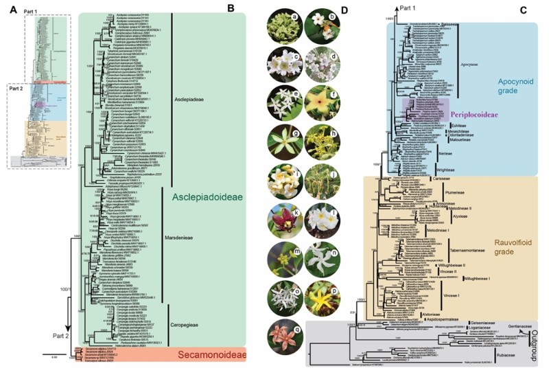 中國(guó)科學(xué)院西雙版納熱帶植物園(以下簡(jiǎn)稱(chēng)“版納植物園”)聯(lián)合中國(guó)科學(xué)院昆明植物研究所,對(duì)夾竹桃科開(kāi)展了質(zhì)體系統(tǒng)發(fā)育基因組學(xué)和多樣性演化歷史的研究。該研究涵蓋夾竹桃科5個(gè)主要類(lèi)群(Apocynoids、Asclepiadoideae、Periplocoideae、Rauvolfioids、Secamonoideae)22個(gè)族(共25個(gè)族)的193個(gè)物種(84屬),其中114個(gè)物種來(lái)自熱帶亞熱帶亞洲(占比58.5%),提升了此前研究中亞洲類(lèi)群取樣不足的缺陷。利用質(zhì)體編碼序列(CDS)超級(jí)矩陣構(gòu)建夾竹桃科植物系統(tǒng)發(fā)育框架,進(jìn)一步選用夾竹桃科四個(gè)大化石信息用于分子鐘定年估算。