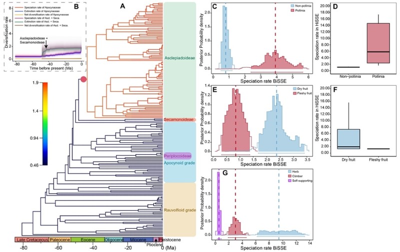 圖2.夾竹桃科物種多樣化分析。A是基于BAMM軟件的物種形成速率分析。B是物種形成速率、滅絕速率和凈多樣化速率隨時(shí)間的變化。C和D是無(wú)花粉塊物種(藍(lán)色)和有花粉塊物種(紅色)多樣化速率的比較。E和F是干果物種(藍(lán)色)與肉果物種(紅色)多樣化速率的比較。G是不同生活型物種多樣化速率的比較。