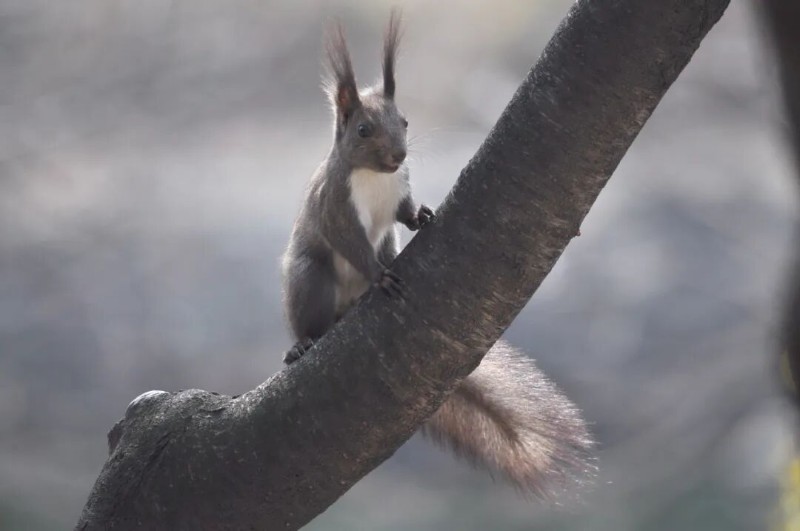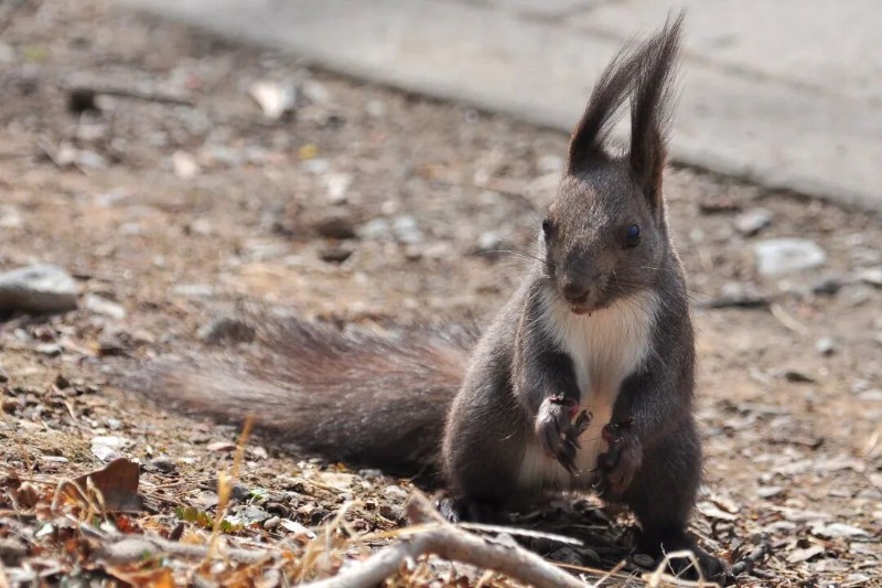 三種松鼠中,北松鼠是體型較大、比較典型的“樹(shù)棲松鼠”,生活在高大的樹(shù)冠層。冬季觀察時(shí),會(huì)發(fā)現(xiàn)其顯著特征是耳朵上有一簇向上的毛,遠(yuǎn)看一副怒發(fā)沖冠的模樣。北松鼠的毛色會(huì)因地域和季節(jié)發(fā)生顯著變化。北京地區(qū)的北松鼠,尤其是國(guó)家植物園常見(jiàn)的多為東北亞種,通常呈現(xiàn)灰褐色、棕灰色或黑色的皮毛。有些個(gè)體更是在夏季時(shí)四肢、肩部及軀體側(cè)面下方會(huì)呈棕黃甚至橙色,而到了冬季大多數(shù)皮毛則呈現(xiàn)棕灰色,偶爾也會(huì)遇到一兩只冬毛呈較淺的灰色,且兩頰、前肢仍帶有棕黃色的個(gè)體。隨著季節(jié)變化,北松鼠身上皮毛不變的位置則是腹部標(biāo)志性的白色。