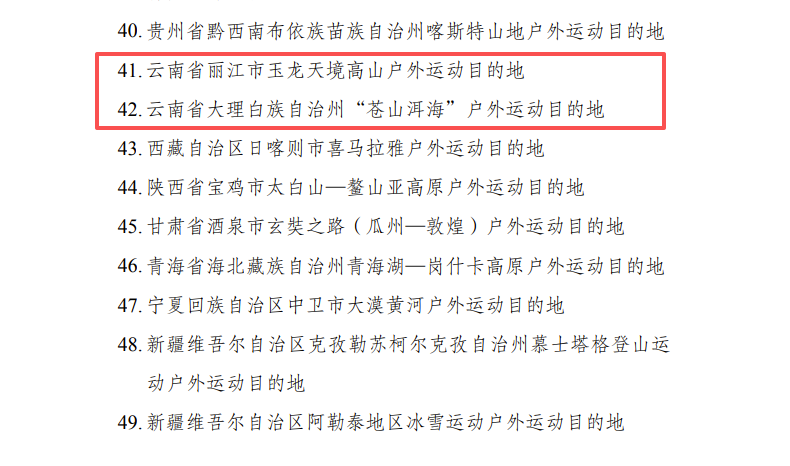 近日,國家發(fā)展改革委、體育總局等六部門聯(lián)合發(fā)布第一批高質(zhì)量戶外運動目的地建設(shè)地區(qū)名單,全國49個優(yōu)質(zhì)目的地入選。其中,云南省麗江市玉龍?zhí)炀掣呱綉敉膺\動目的地、云南省大理白族自治州“蒼山洱海”戶外運動目的地上榜。