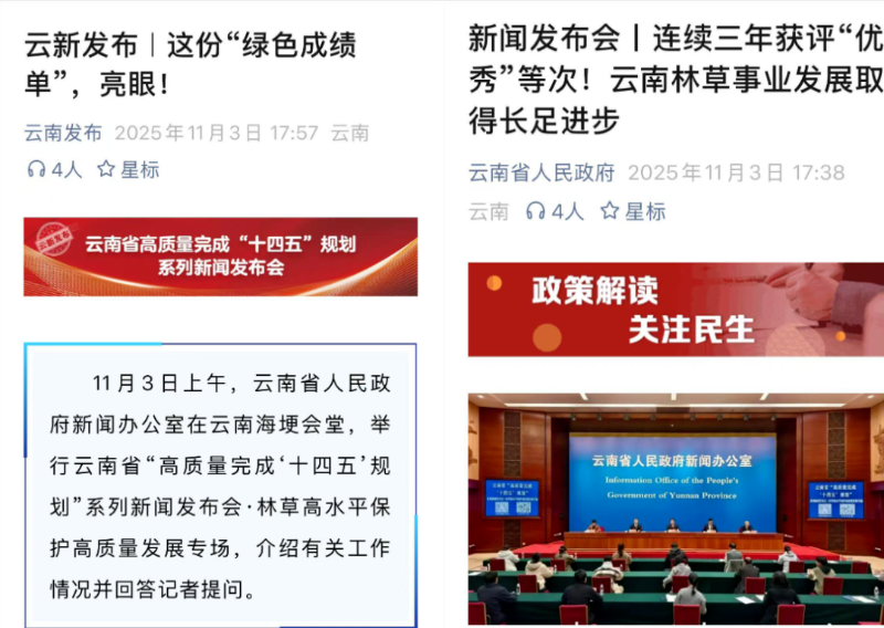 2025年11月3日上午,云南省人民政府新聞辦公室在昆明海埂會(huì)堂玉蘭廳,舉行云南省“高質(zhì)量完成‘十四五’規(guī)劃”系列新聞發(fā)布會(huì)·林草高水平保護(hù)高質(zhì)量發(fā)展專場(chǎng),邀請(qǐng)?jiān)颇鲜×謽I(yè)和草原局介紹“十四五”期間云南林草高水平保護(hù)高質(zhì)量發(fā)展有關(guān)工作情況。