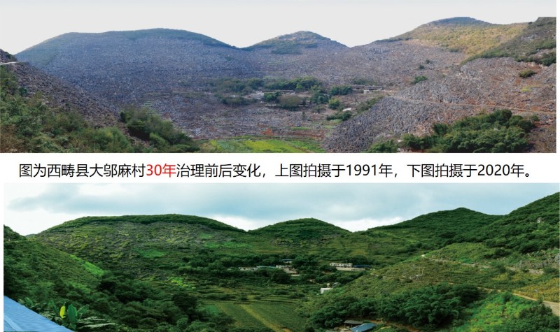 “曾被外國(guó)專家斷言‘基本失去人類生存條件’的地方,如今已換了人間。”西疇99.9%的國(guó)土面積為山區(qū),裸露、半裸露巖溶地貌占比達(dá)75.4%,是我國(guó)石漠化最嚴(yán)重的地區(qū)之一。西灑鎮(zhèn)大烏麻村小組的新舊對(duì)比圖尤為直觀:十年前山體裸露、溝壑縱橫,如今綠樹(shù)成蔭、郁郁蔥蔥,成為西疇人“我與青山共白頭”的生動(dòng)注腳。