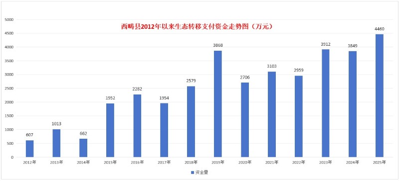 生態(tài)保護(hù)與經(jīng)濟(jì)發(fā)展的雙贏,在西疇的生態(tài)轉(zhuǎn)移支付數(shù)據(jù)中清晰可見(jiàn):2012年獲得607萬(wàn)元,2025年增至4460萬(wàn)元,13年間增長(zhǎng)6倍,累計(jì)達(dá)3.5億元,成為縣域主要財(cái)政收入之一。