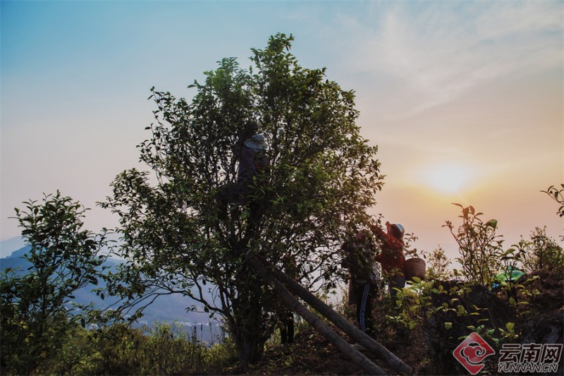 天剛亮,臨翔區(qū)邦東鄉(xiāng)昔歸村茶農(nóng)已經(jīng)搭好架子開始采摘古樹茶(周劍平攝)